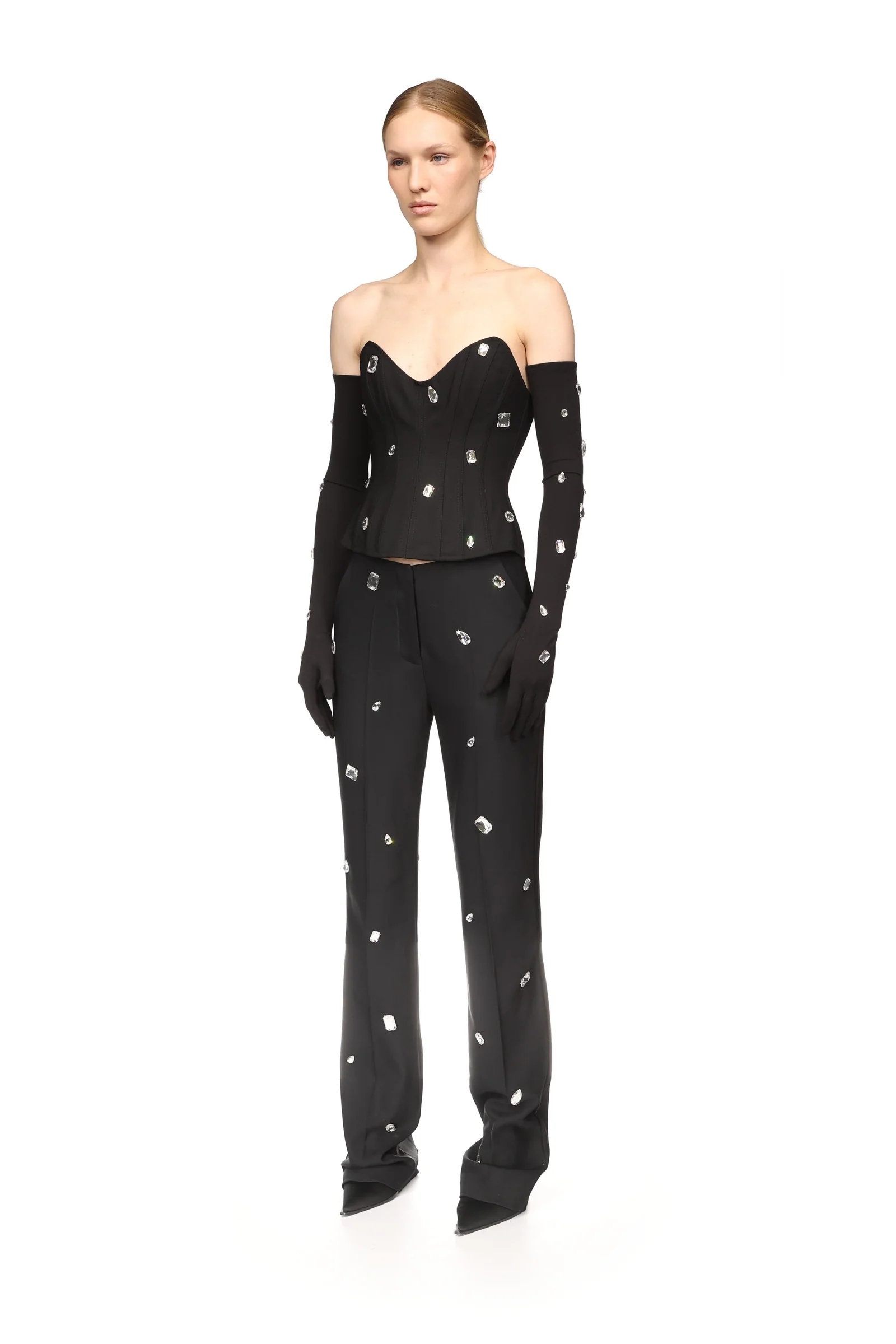 Made in the UK with black tailoring wool, this corset top has a sweetheart neckline and chunky silver crystals embroidered all over. It fastens with a zip closure at the back.