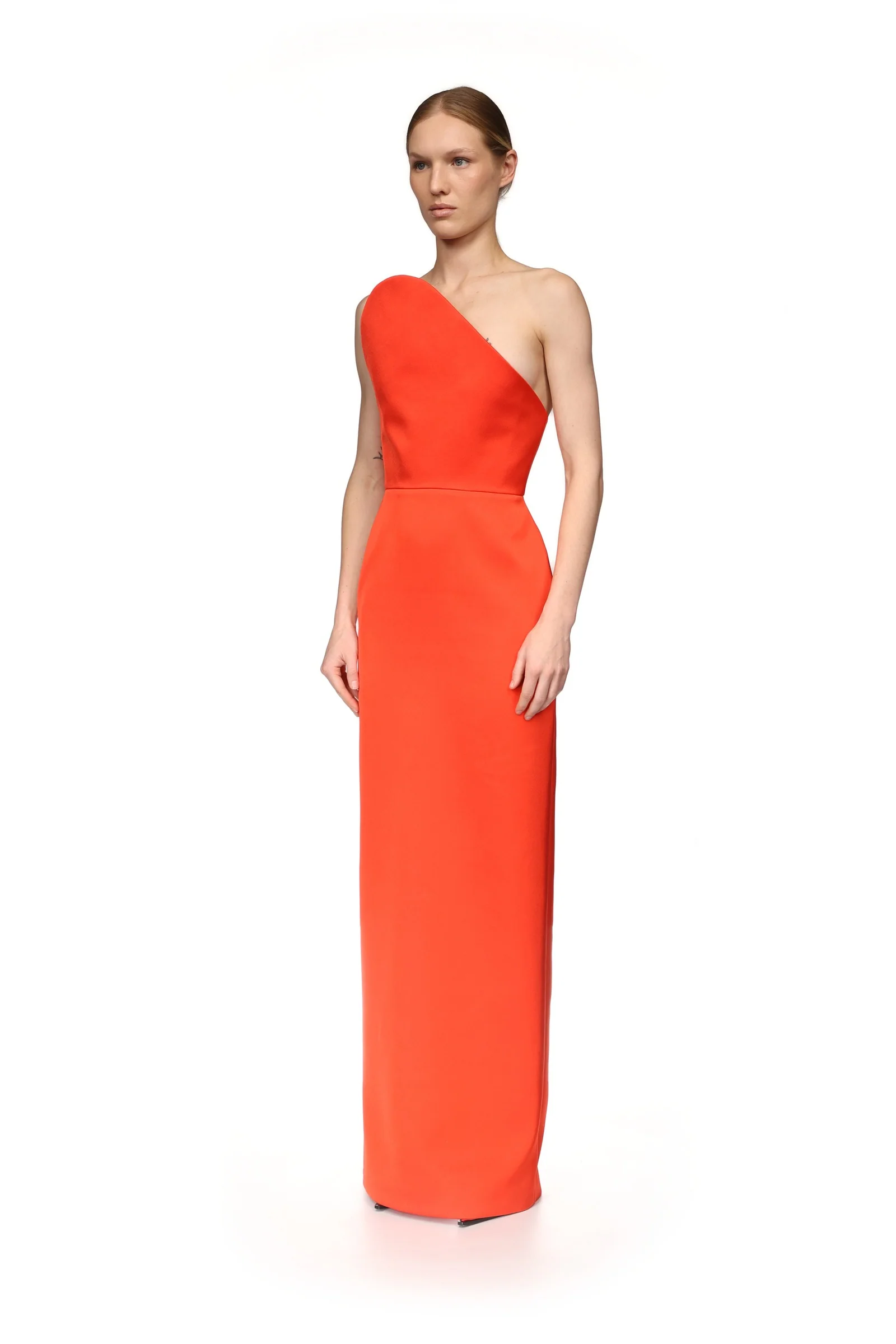 Made in the UK with red satin, this elegant, floor-length gown has an asymmetric curved structure design at the neckline. It fastens with a hidden zip closure at the back.