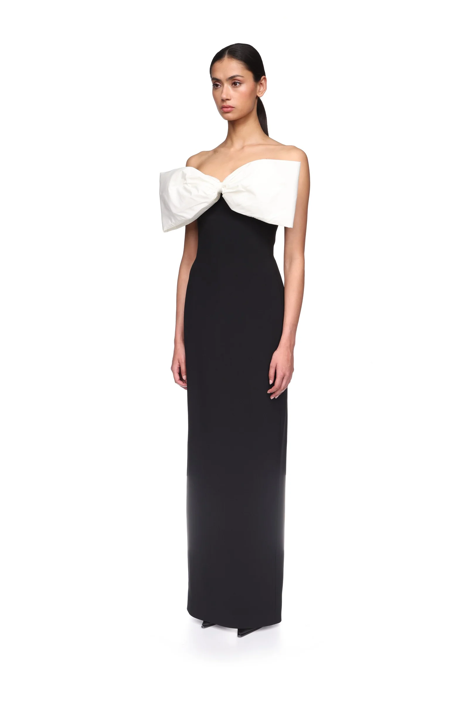 Made in the UK with a black stretch cady, this floor-length gown features a white taffeta off-shoulder bow, creating a striking colour contrast. This dress fastens with a hidden zip closure at the back.