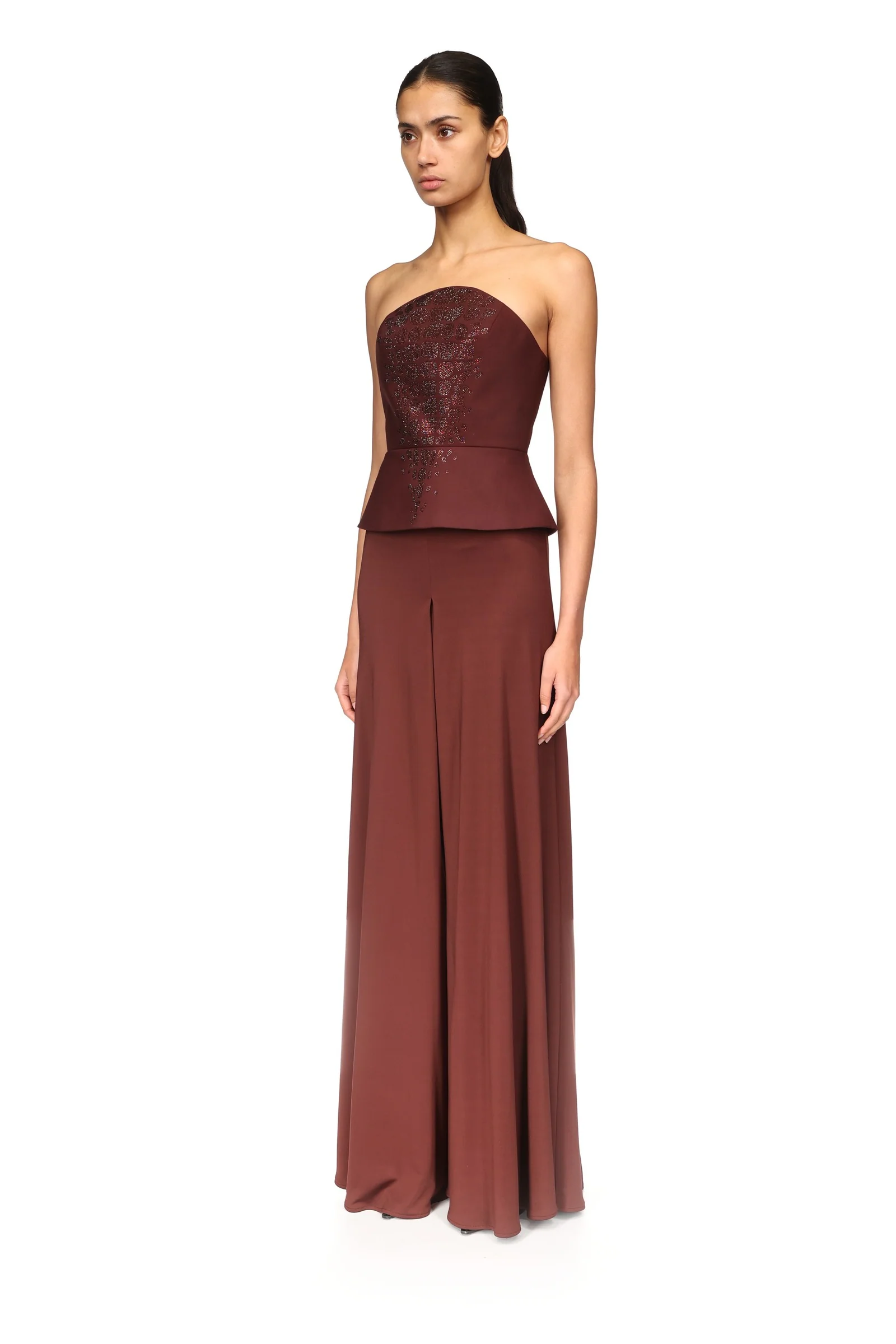 Made in the UK with burgundy tailoring wool, this strapless top features a rounded neckline, burgundy rhinestones embroidered in a crocodile skin design, and a flared-out hem. It fastens with a hidden zip closure at the back.