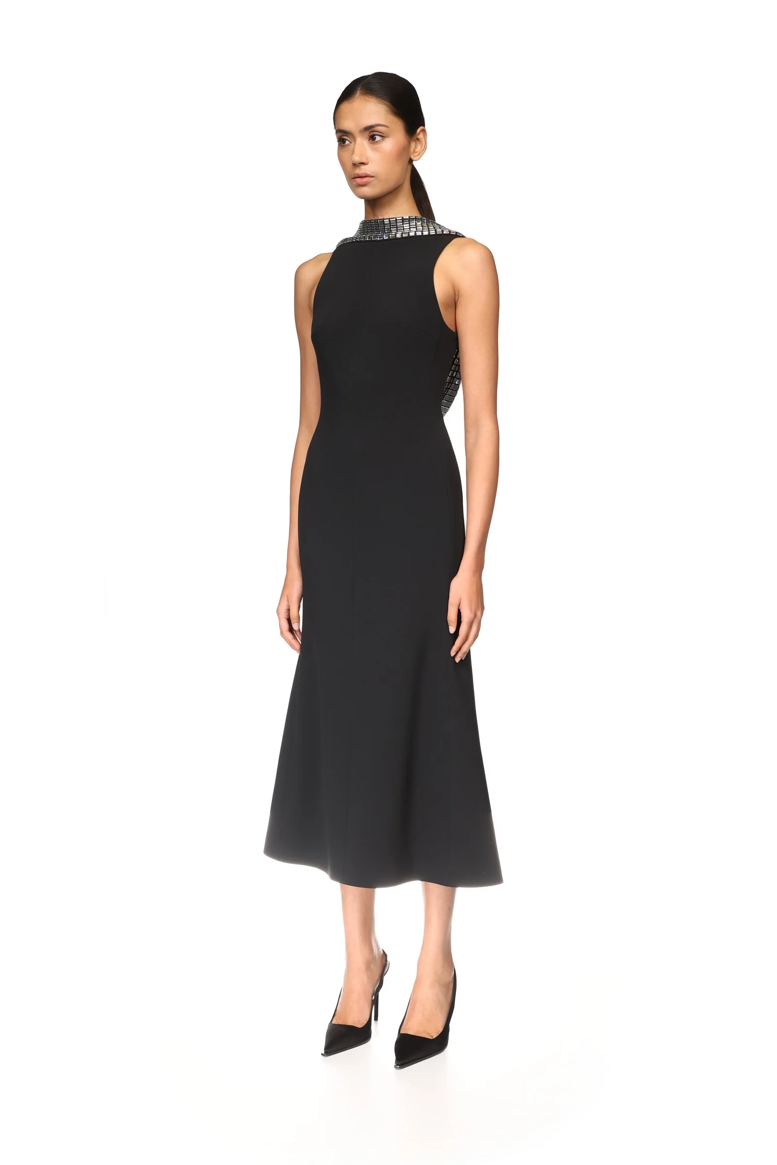 Made in the UK with black stretch cady, this sleeveless midi dress has a crystal rhinestone detail at the neck which drapes at the back. The hemline flares out, creating an hourglass silhouette. It fastens with a hidden zip closure at the back.