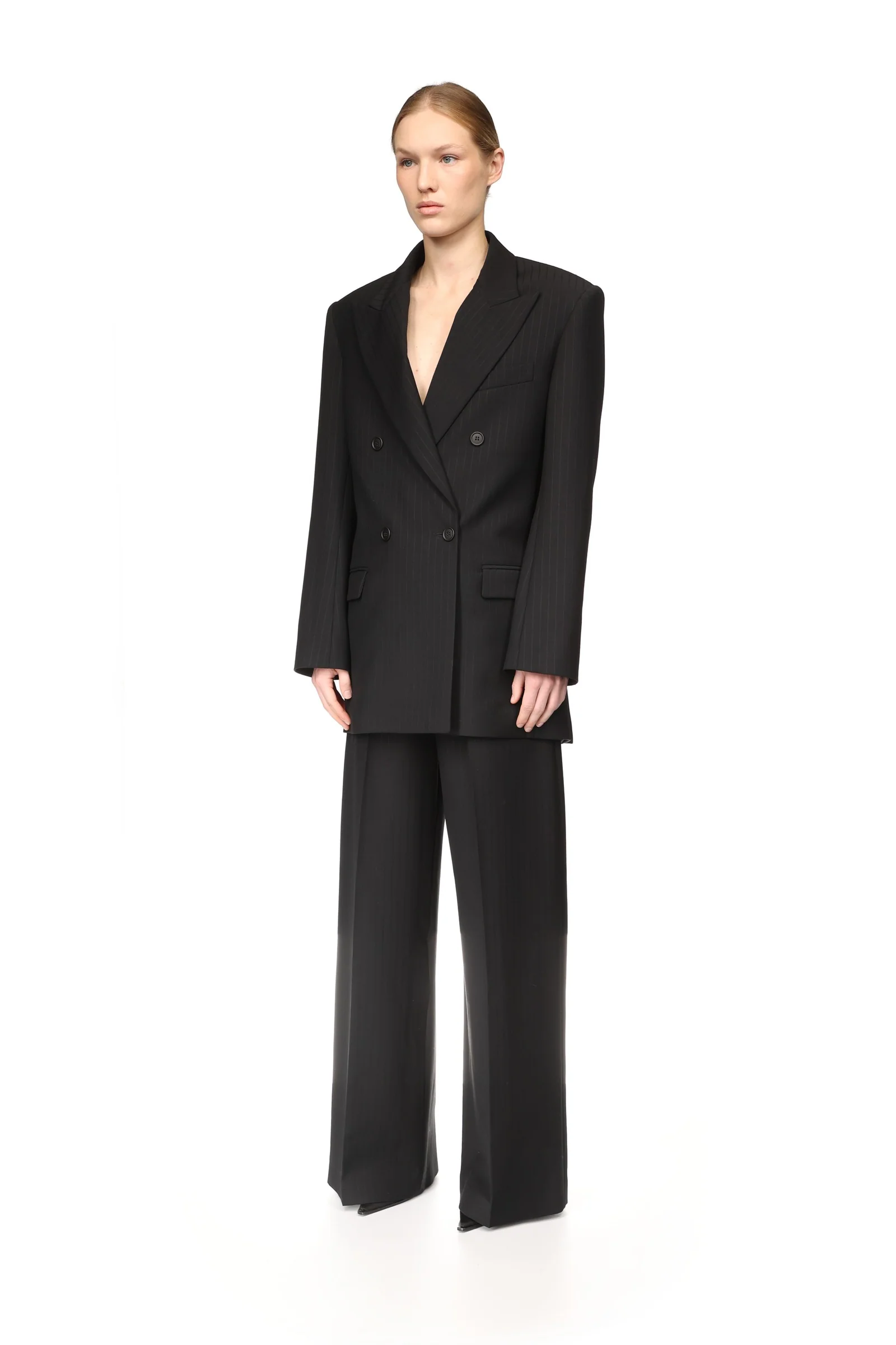 PINSTRIPE WOOL TAILORED TROUSERS WITH CRYSTAL BUCKLE BELT