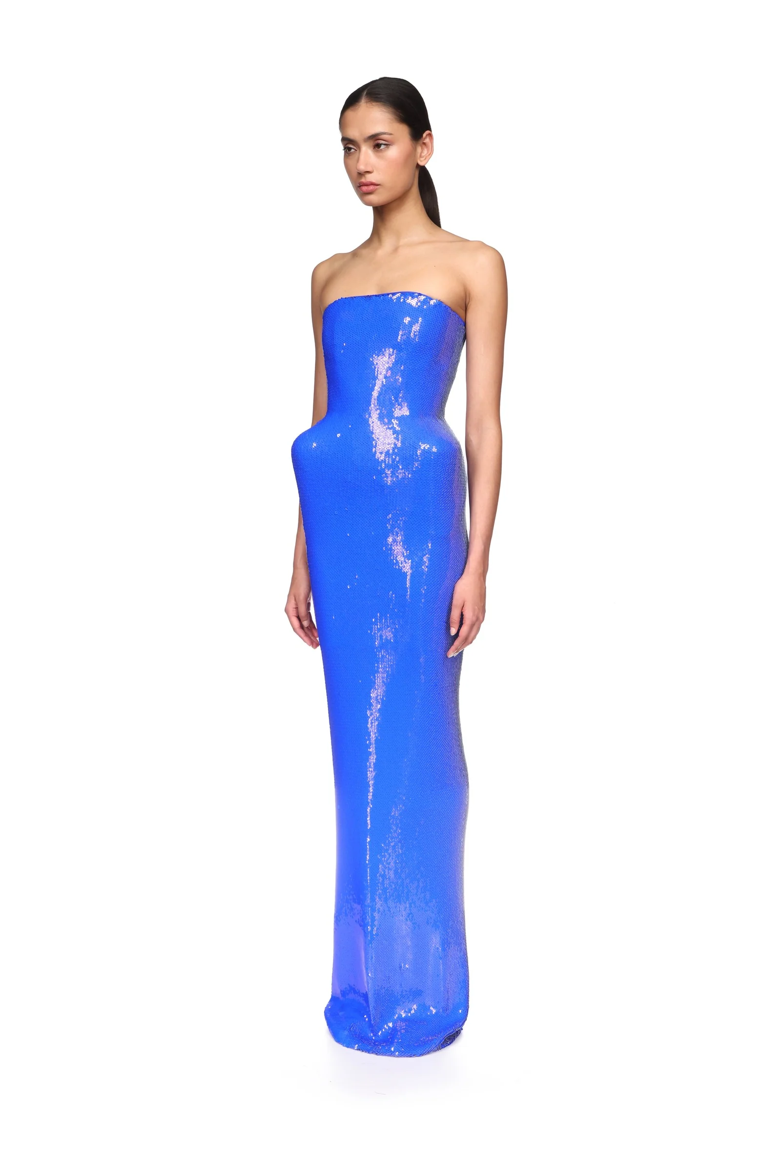 Made in the UK with recycled sequins, this blue strapless gown features statement padded hip details. This gown fastens with a hidden zip closure at the back.